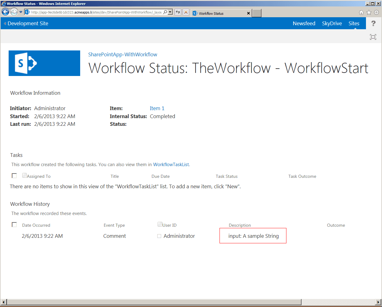 After the workflow is completed, the workflow history log shows the value entered in the initiation form.