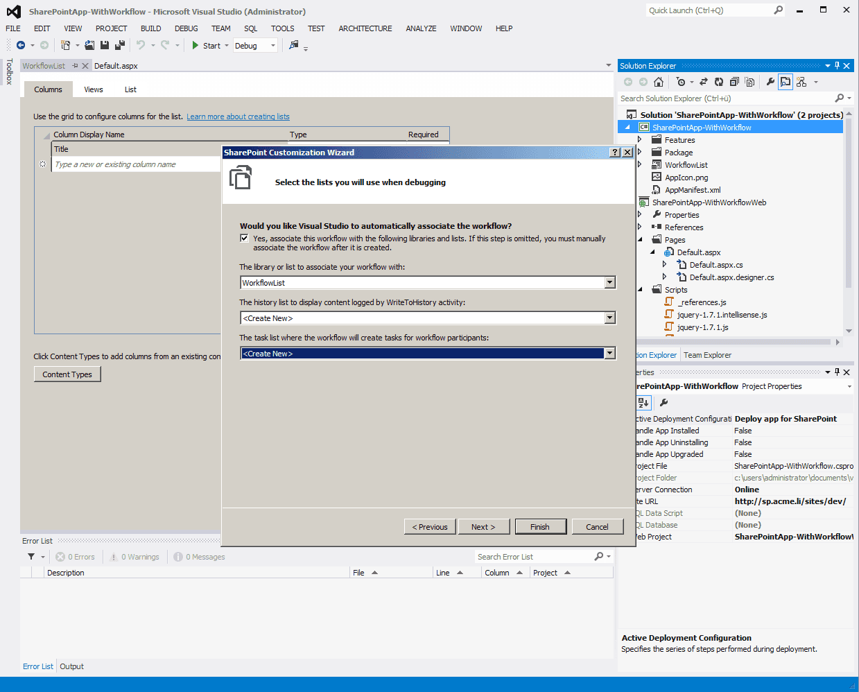 Now that we have a list, we can add a workflow to be run on that list by adding a new Item of type “Workflow”to the SharePoint AppWeb project. Set the workflow to start manually and associate it with the previously created list. Select the according items to create a Workflow History And Workflow Tasks List for the Workflow.