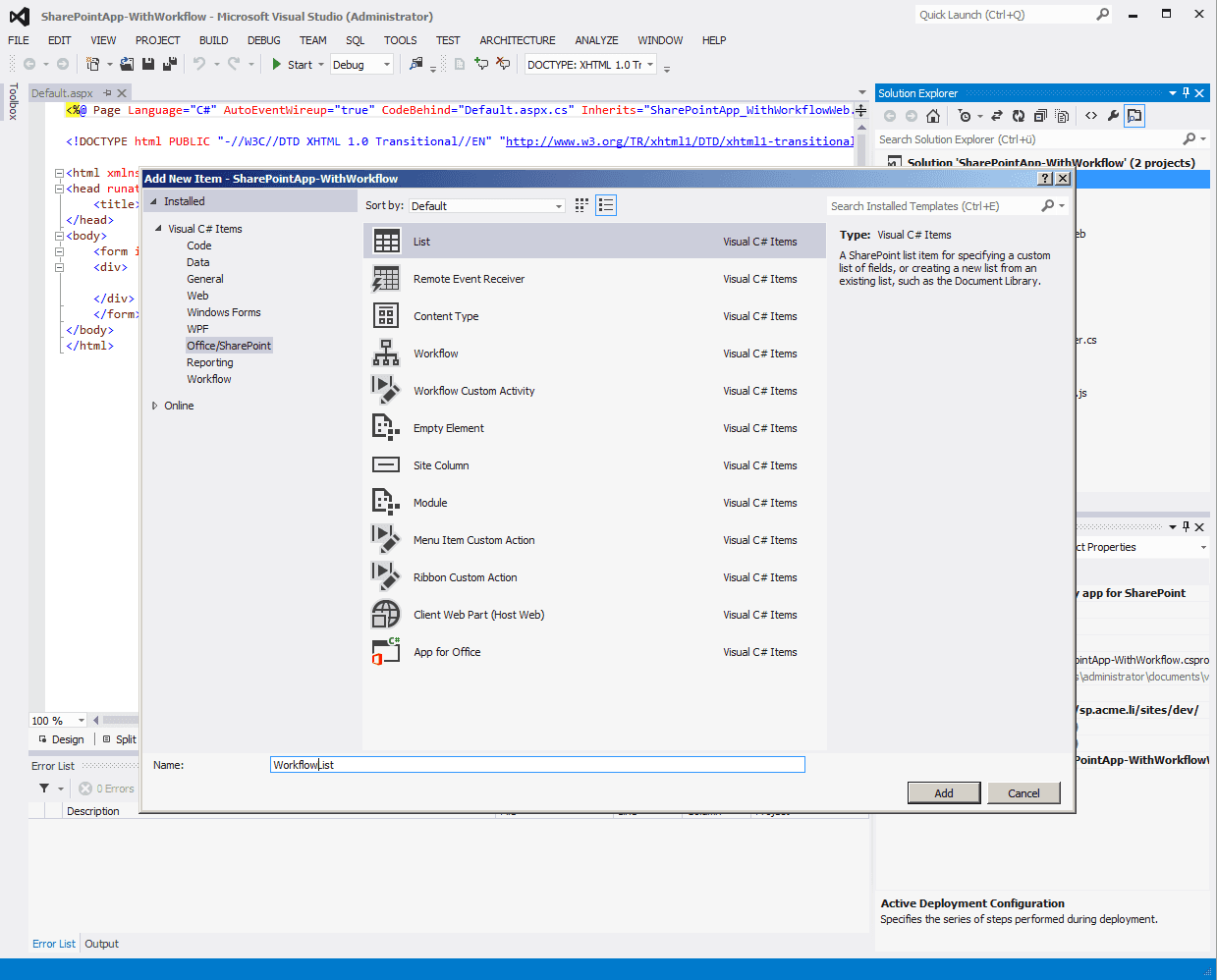 First of all we need to add a list to host the workflow by adding a new item of type “List” to the SharePoint AppWeb project.