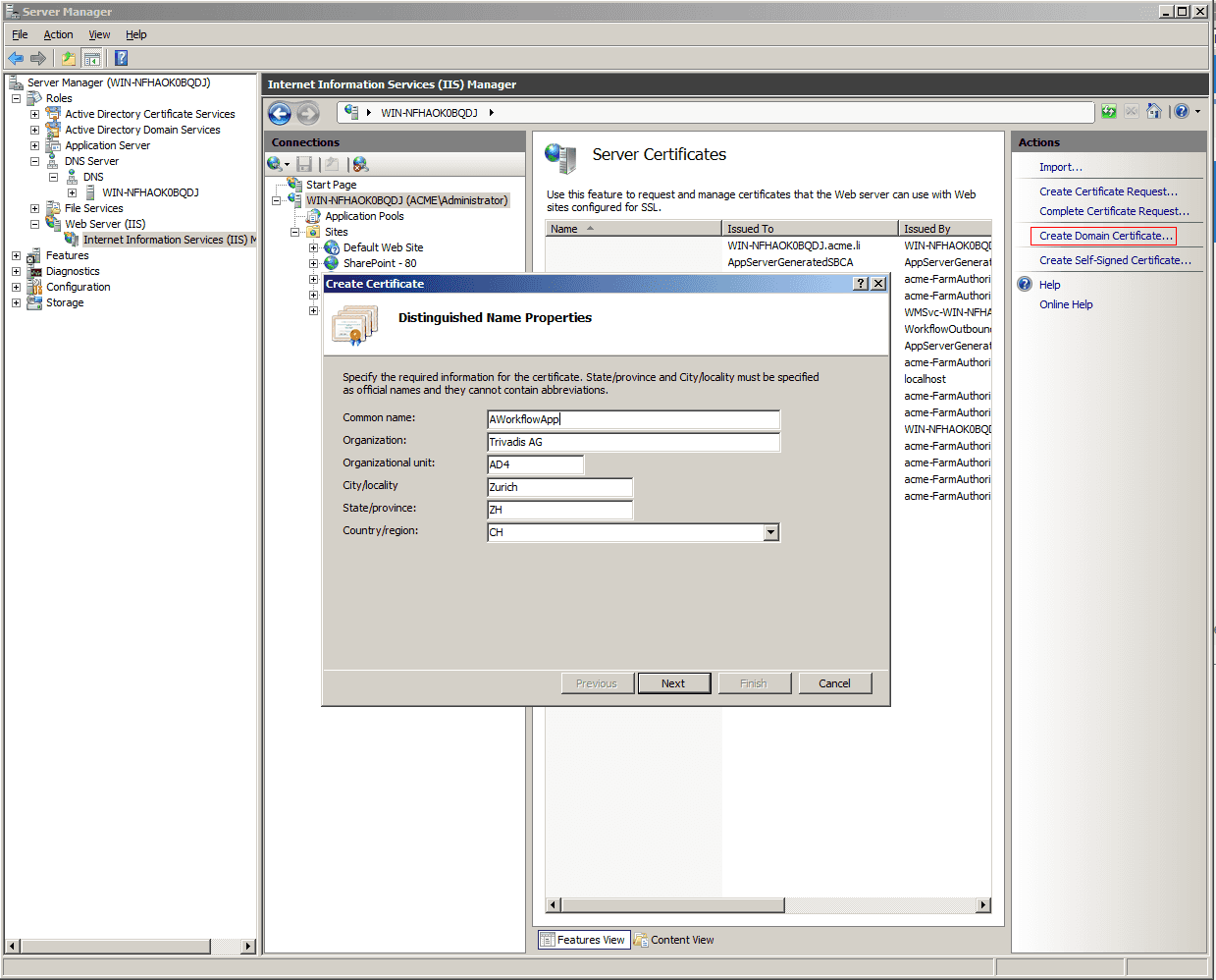I am using Active Directory Certificate services my development environment, so I am able to create certificate with my own trusted Root Authority in the IIS configuration UI by clicking “Create Domain Certificate”.