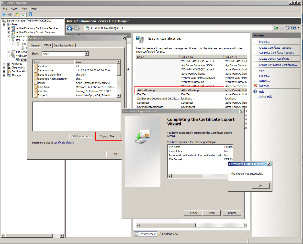 After creating the certificate, both the public (.cer) and the private (.pfx) key have to be exported. The .cer file is exported by opening the certificate and hitting “Copy to file” on the “Details” tab. Use the default settings in the dialog.