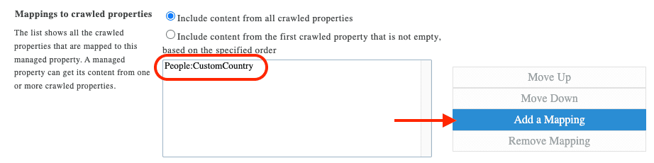 - Click âAdd a Mappingâ to map the Crawled Property âPeople:CustomCountryâ on the âManaged Propertyâ