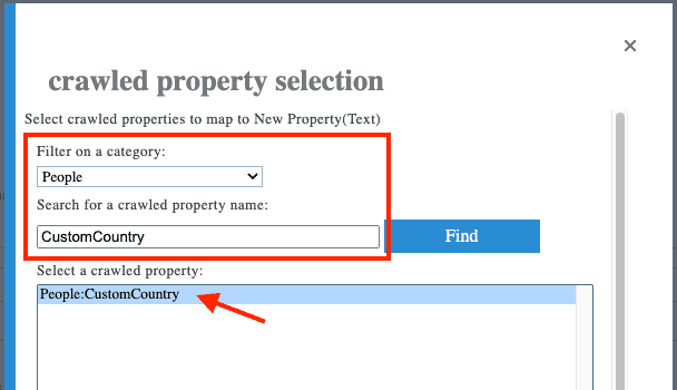 Note: It may take several hours for the Crawled Property âPeople:CustomCountryâ to show up.